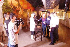在《常中丞筆記》中,火腿叫做蘭熏,《東陽縣志》稱熏蹄,《本草求原》稱南腿,由此可觀,火腿此物名聲深遠,頗受眾人喜愛,不然也不會有如此多的“小名”。 10月17日這天,浙江經(jīng)視旅游節(jié)目《48小時》攝制組團隊在中國火腿博覽館、世界火腿博覽館開始了“火腿”的探索之旅,從起源伊始談至繁華盛宴,期間故事種種萬千。 從中國火腿博覽館入口處的“百姓勞軍圖”便開始了這場對話。而在博覽館內(nèi)的火腿制作流程雕塑則完全將攝制組吸引,無論是考驗刀工的制作火腿頭道工序——修胚,還是考驗“鹽功”的——上鹽環(huán)節(jié),都深